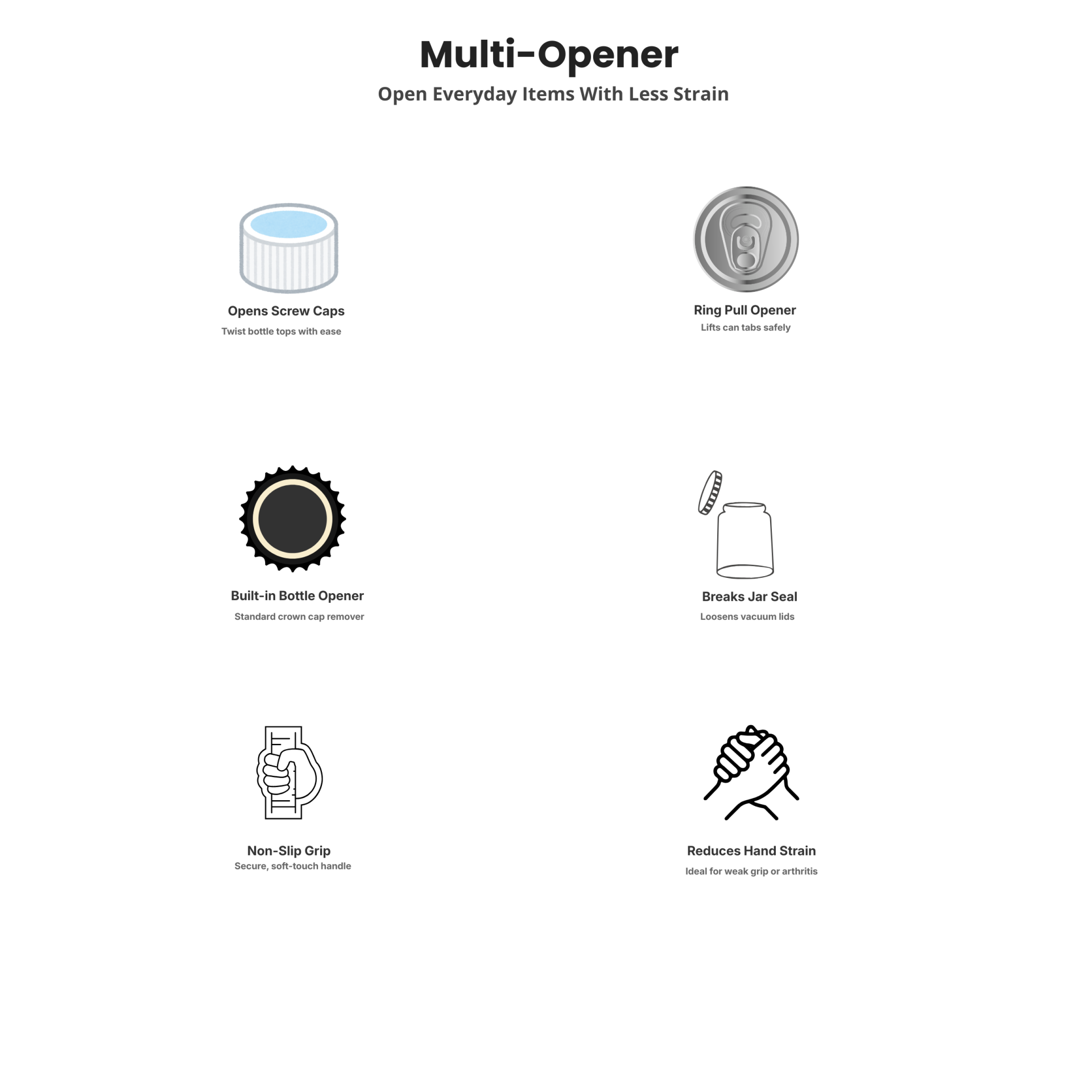 A lightweight kitchen opener designed to make jars, bottles and cans easier to open, with added grip and leverage for everyday use.